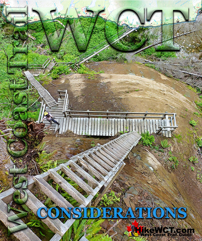 It's hard to get reliable information on injuries and fatalities on the West Coast Trail. You might as well start calling it that as it's a hike that requires a lot of studying beforehand. Whenever you hike a long trail in British Columbia and the danger of bears is so overshadowed by other dangers as to be insignificant, you'd better worry. You need to examine tide charts to determine your route. Most beach routes have parallel forest trails. For the most part you can walk the beach sections pretty care free, however there are a couple areas where you could find yourself blocked by the rising tide. Or worse, trapped by it. If you don't put your tent above the high tide mark, you may become engulfed in water as you sleep. In the summer months you can find lots of nice sand above the high tide mark, close to the rainforest wall. Imagine waking up to ocean waves soaking into your tent. To be safe from high tide, look for grass and weeds in the sand, camp there. Grass tends to not grow if the tide reaches them.